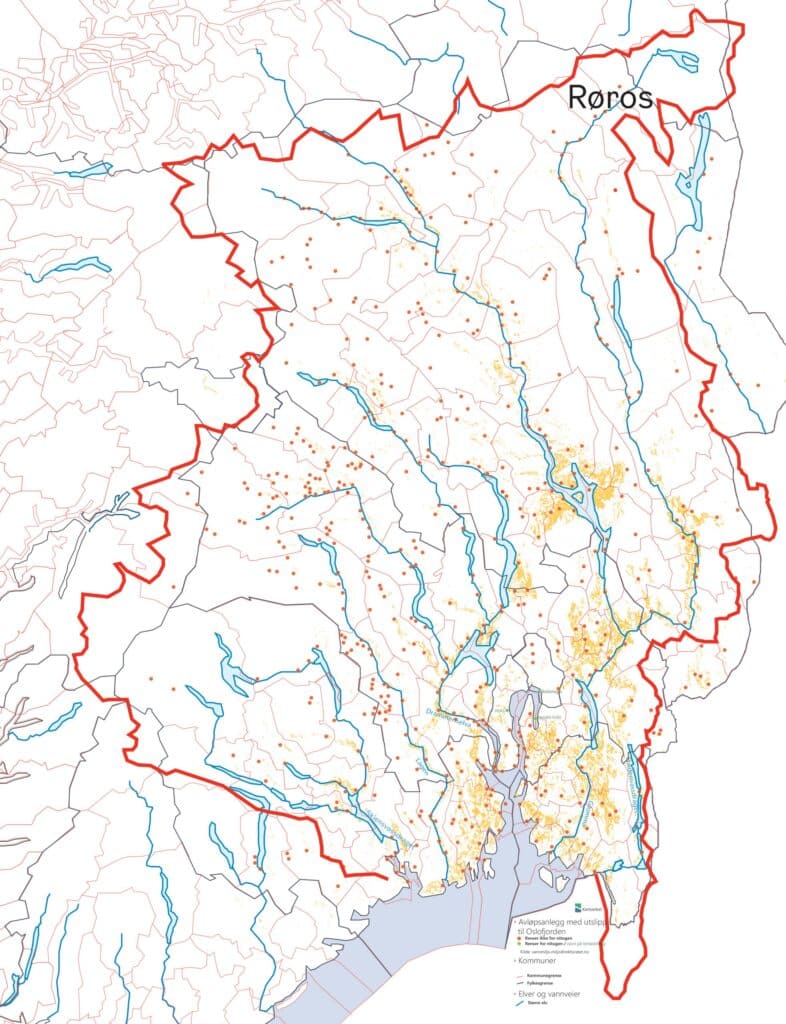 Oslofjorden står overfor en alvorlig miljøutfordring, og redningen av fjorden avhenger av innsatsen til hele 118 kommuner. Området innenfor den røde linjen på kartet omfatter disse kommunene, hvor alt vann som faller i områder som Røros til slutt havner i Oslofjorden. For å begrense mengden nitrogen og fosfor som når fjorden, er det nødvendig med omfattende rensing av avløp og implementering av tiltak i jordbruket i alle disse kommunene.