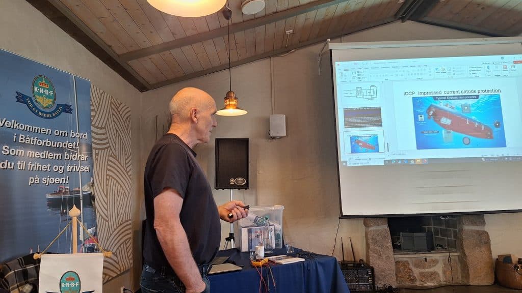 Regionens nestleder Roger Karlsnes, holdt et foredrag om galvanisk korrosjon i havner og båter. Dette er egentlig et eget fag, men prinsippene ble gjennomgått. Forsamlingen fikk diskutert egne erfaringer, tips og råd om emnet. Samt utvekslet litt om hva de forskjellige foreningen har til krav til landstrøm. Å ha et galvanisk skille på landstrømmen trenger ikke koste mye, og kan spare båteiere store beløp om det blir mye korrosjon.